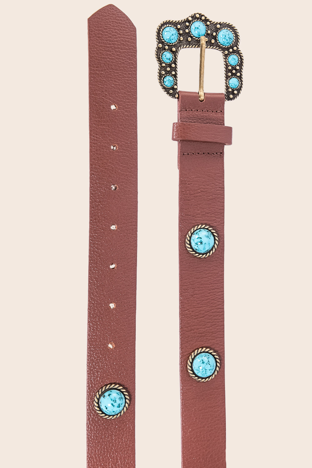 O cinto Inara, 100% couro, possui fivela e adornos em metal com pedras turquesas. O azul turquesa é muito usado no estilo boho chic para compor os looks boêmios do verão.