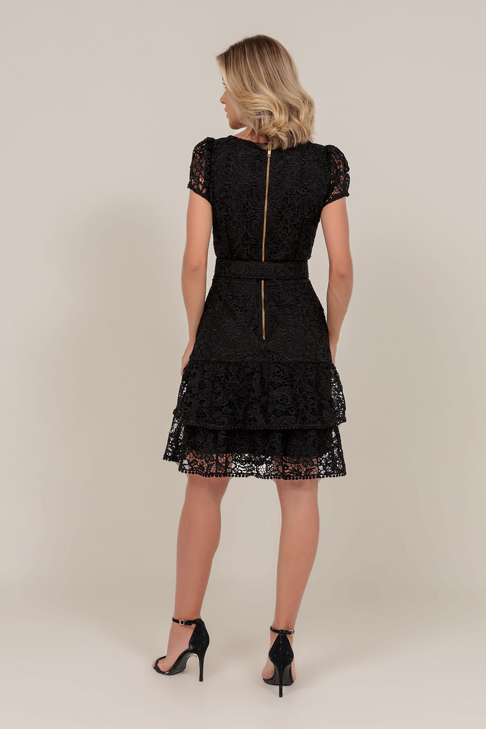 Este look em guipure possui modelagem conforta"¢vel, que pode ser acinturada com o cinto que acompanha o modelo, tem decote redondo, manga curta, fechamento posterior por zi"¢per e comprimento curto com babados e aviamento na barra.