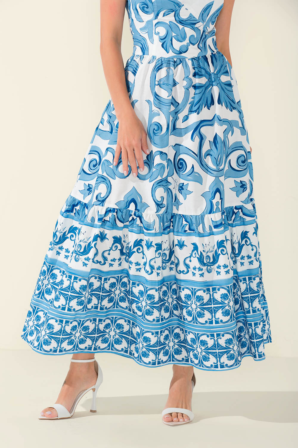 Vestido em tricoline leve com estampa de azulejos portugueses, que adiciona um toque cultural e vibrante. Possui decote coração, manga copinho e modelagem acinturada que valoriza a silhueta. O comprimento novo longo e o zíper invisível garantem caimento fluido e elegância com conforto. COMPOSIÇAO:100% Algodão