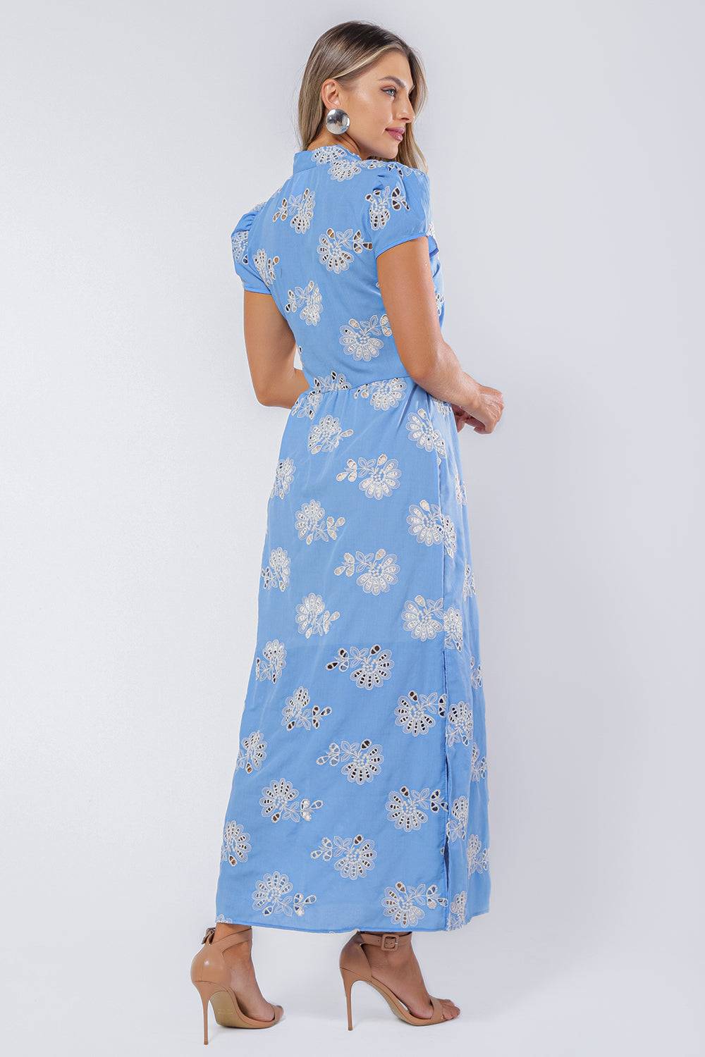 O vestido Alice é confeccionado em tecido plano, possui richelieu no formato de flores, caimento acinturado, gola padre, fechamento frontal por botões de massa tingidos na cor do tecido, aselha, mangas curtas com leve franzido e comprimento novo longo.