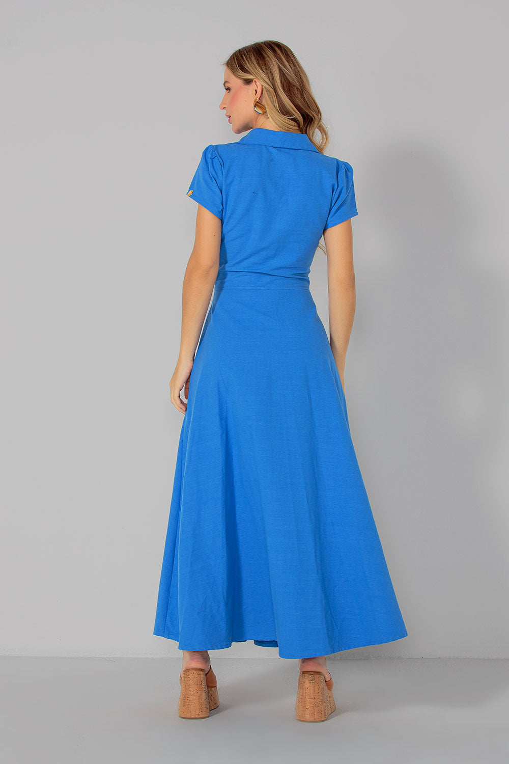 O vestido Rayza em algodão tem comprimento longo, acabamento pespontado, colarinho e mangas curtas e fechamento frontal por botões. A amarração frontal usando ilhós e cordão permite que você ajuste conforme a sua cintura. 226
